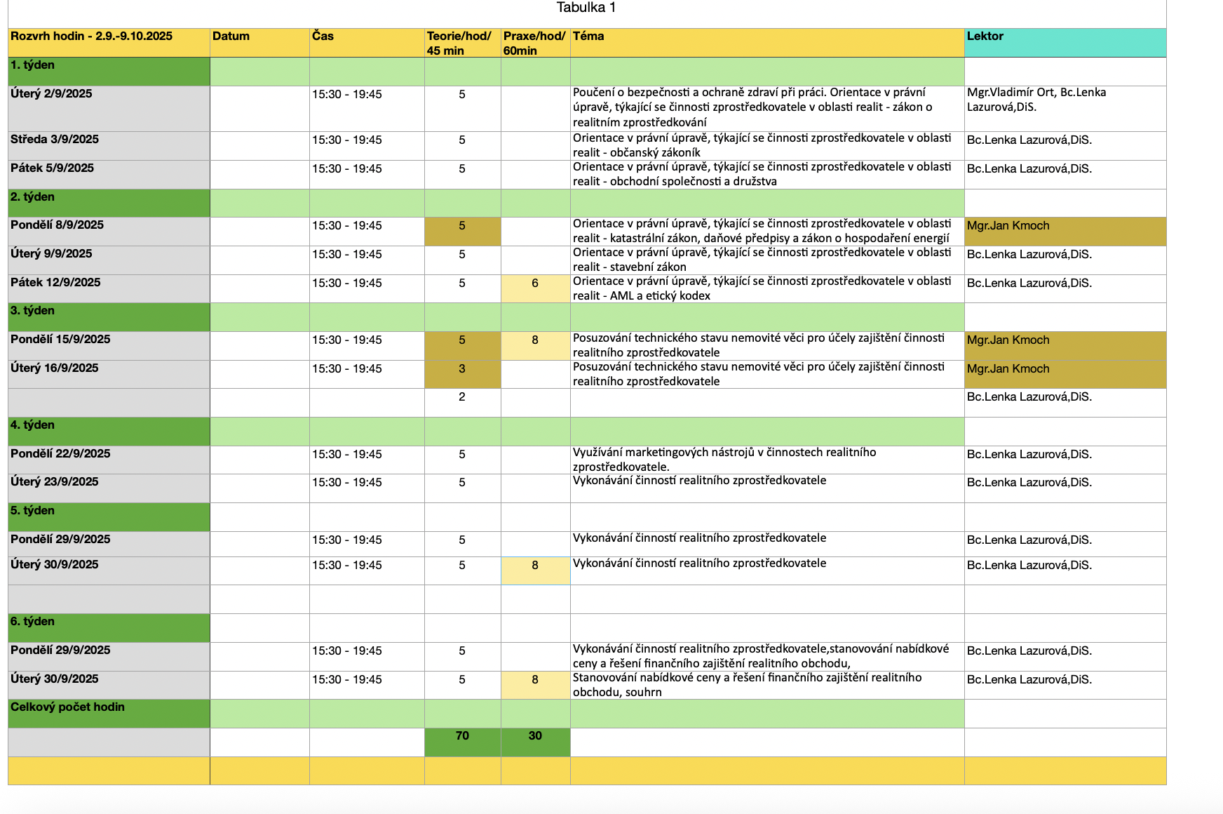 - 70 hodin teorie – výuka (3 x týdně, 5 hodin denně, podrobněji u kontaktní osoby)